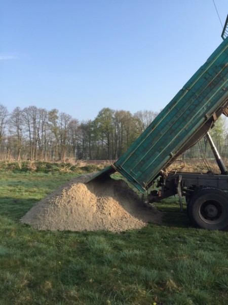 Hier sehen Sie, wie der dazu nötige Sand bei uns abgeladen wird.